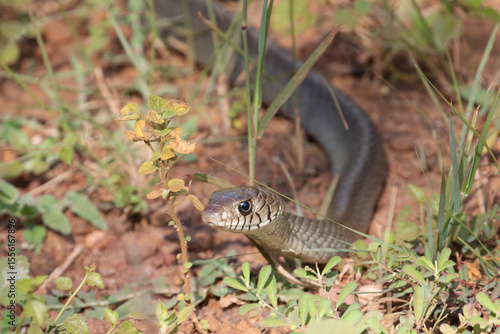 A rat snake slithers through the grass in the wilderness of Sri Lanka.