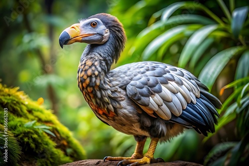 dodo, bird, extinct, mauritius, flightless, prehistoric, ancient, wildlife, nature, animal, illustration, realistic, detailed, tropical, jungle, forest, foliage, green, moss, tree branch, avian, creature, history, paleontology, reconstruction, iconic, unique