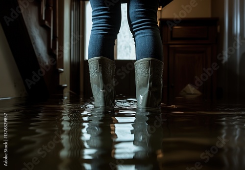 A realistic indoor flood scene with a pair of feet in brown rain boots standing in shallow water, the water reflecting soft light, with a blurred indoor background