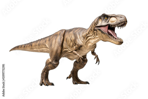 a realistic model of a tyrannosaurus rex showcasing its detailed features and fierce expression positioned dynamically against a white background