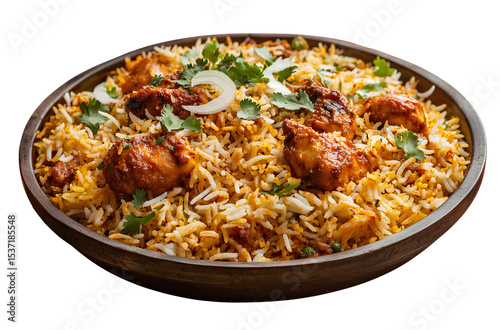 A realistic photograph of biryani with chicken, with a transparent background.