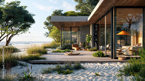 A rear view of a modern beachfront house with large glass doors opening to a wooden deck, a sandy pathway leading to the beach, and outdoor showers.