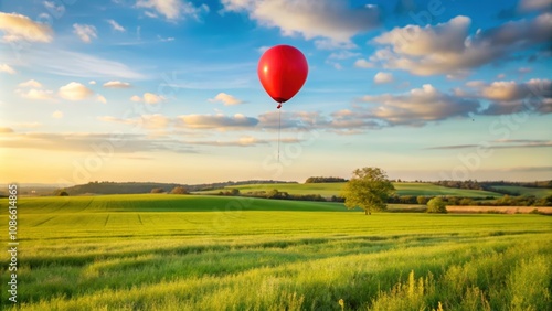red, balloon, floating, sky, cloud, blue, green, field, grass, meadow, horizon, landscape, nature, outdoors, summer, sunny, bright, day, countryside, rural, tree, foliage, sunset, evening, gold, light, huge, open, simple, tranquil, peaceful, serene