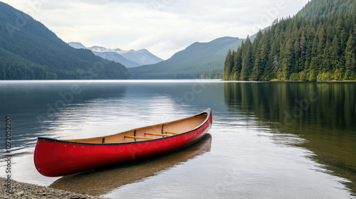 A red canoe sits in the water near a lake. The scene is peaceful and serene, with the calm water reflecting the surrounding mountains. The canoe is the only object in the image