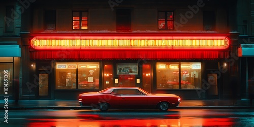 night, city, street, urban, red, car, vehicle, neon, signs, light, building, window, rain, wet, asphalt, vintage, classic, retro, modern, dark, moody, minimalist, abstract, graphic, design, illustration, city landscape, downtown, american, dinner, architecture, transportation, travel, drive, road