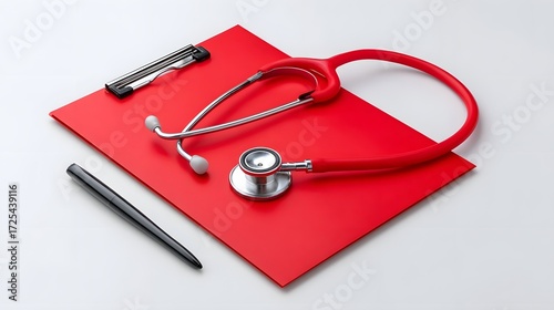 medicals, health care, stethoscope, clipboard, pen, red, equipment, diagnosis, exam, hospital, clinic, check-up, paperwork, treatment, doctor, nurse, health, wellness, care, instrument, tool, report, record, medication, patient, prescription, therapy, analysis, monitor