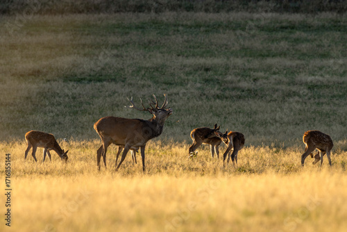 A red deer during the rutting season. Herd of the red deer in natural habitat in autumn.
