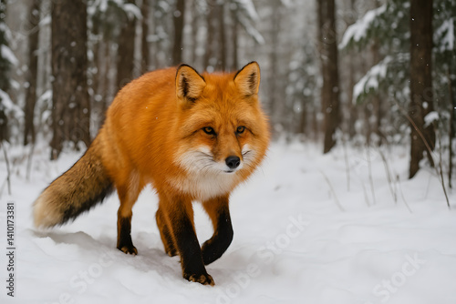 A red fox walking through a snowy forest with trees in the blurred background during the winter season