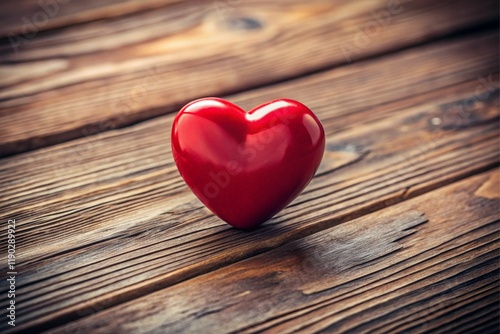A red heart is sitting on a wooden surface