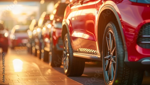 red, suv, parked, car, dealership, sunlight, gold, background, blurred, vehicle, detail, colours, shiny, bright, row, new, modern, chrome, clean, fresh, parking, lot, summer, light, warm, vibrant, automotive, industry, sale, purchase, shop, market, exterior, front, transportation, travel, metallic, daylight, sleek, display, show, shopping, attractive