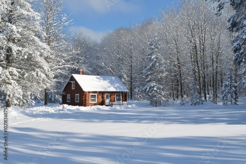 A red wooden cabin sits in a snowy forest on a sunny winter day. The cabin has a white roof and windows, and there is a snowy path leading up to it. The trees are bare and covered in snow.