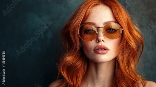 A red-haired woman with sunglasses and shoulder-baring clothing.