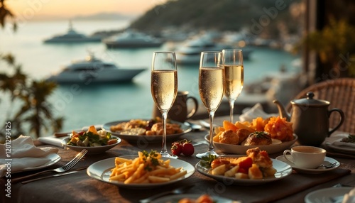 A refined table showcasing three champagne flutes and exquisite cuisine, reflecting a luxurious vacation ambiance