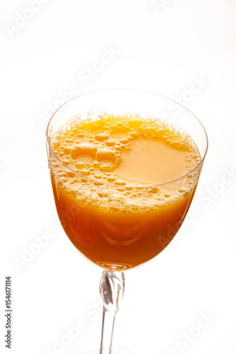 A refreshing glass of freshly squeezed orange juice with a frothy top, served in a elegant clear wine glass against a clean white background. Perfect for food, beverage, and healthy lifestyle themes.