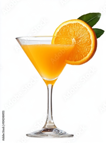A refreshing orange cocktail in a martini glass garnished with an orange slice and leaves.