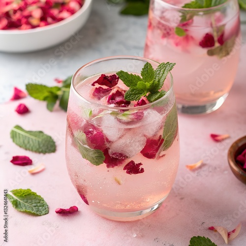 A refreshing rose lemonade served in a glass with ice, fresh mint leaves, and pomegranate seeds. The combination of floral, citrus, and fruit flavors makes it a visually appealing and delicious drink