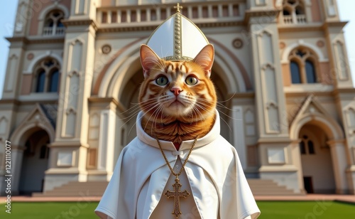 A regal cat dressed as a pope, complete with a white papal hat, cape, and a cross necklace, sitting on a sunny day.