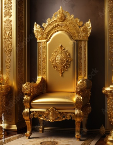A regal golden throne with intricate carvings and a jewel-encrusted back, standing majestically in a grand chamber.