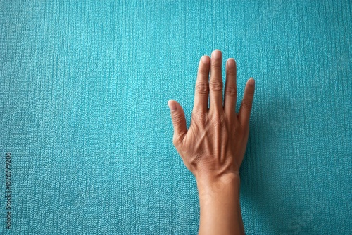 A relaxed hand on a bright yoga mat, evoking calmness, mindfulness, and wellness.