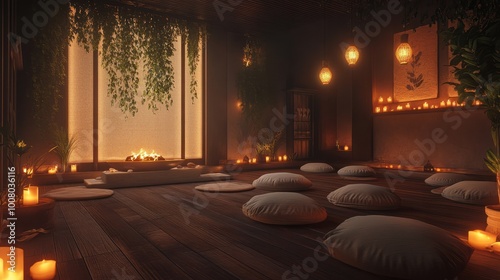 A relaxing, cozy meditation room with cushions, candles and warm lights.