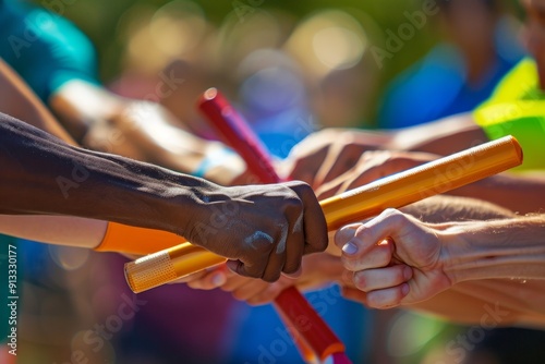 A relay race with teammates passing the baton, illustrating cooperation and coordination