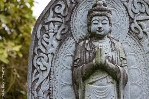 A religious stone statue of Bodhisattva Samantabhadra at Japanese buddhism temple