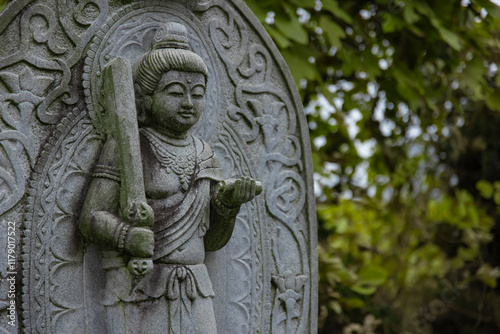 A religious stone statue of Manjusri at Japanese buddhism temple