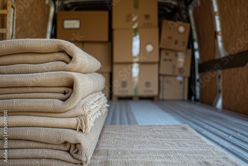A removal van with fabric blankets stacked and cardboard boxes in the background representing moving furniture protection storage packing and transportation