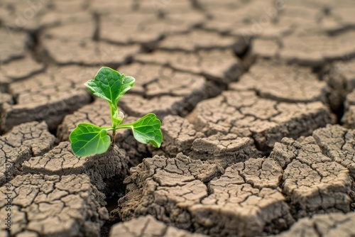 A resilient plant sprouting through cracked, dry soil, symbolizing growth, hope, and determination against adversity in a barren landscape.