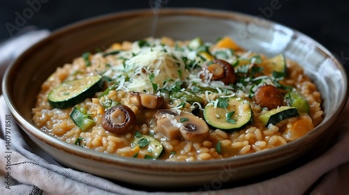 rich, creamy, vegetable, risotto, rice, cooked, mushroom, courgette, asparagus, infused, white, wine, finished