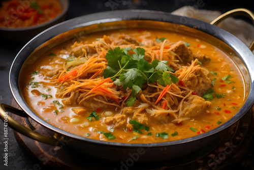 A rich, creamy chicken haleem, garnished with fresh herbs and colorful chilies, served in an authentic metal bowl