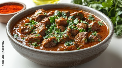 A rich meat curry simmers gently, topped with vibrant cilantro and spices