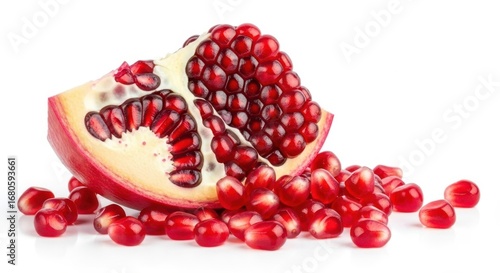 A ripe pomegranate cut open, showing its juicy red seeds, isolated on white background