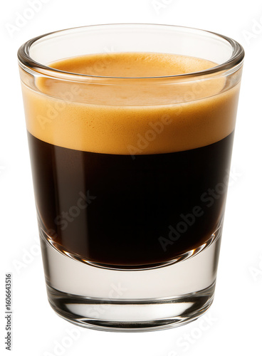 A ristretto shot in a transparent shot glass, displaying a layered effect with crema on top