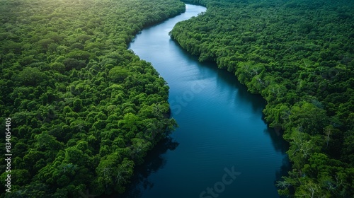 A river runs through a lush green forest in the distance, AI