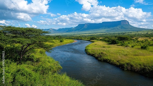 A river runs through a lush green valley with a mountain in the background. The scene is peaceful and serene, with the water reflecting the blue sky above