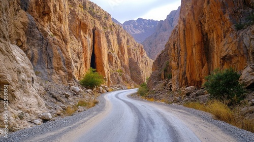 A road curving through a canyon, with steep, colorful rock formations on both sides.