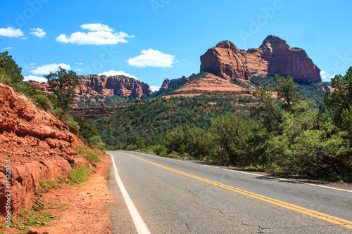 landscape, road, travel, arizona, cloud, road trip, us, arid climate, blue skies, desert, dividing line, geography, geology, highway, horizontal, nature, pretty, rock formation, rock, scenic, travel destination, tree, vanishing point