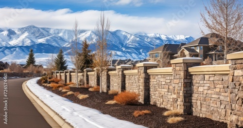 A Road Lined with a Stone Brick Fence, Offering Views of Snowy Peaks and a Cloudy Sky in a Scenic Neighborhood