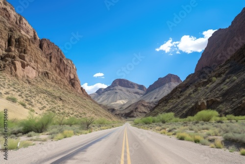 a road trip through a national park, with scenic views, clear blue skies and towering mountains, created with generative ai