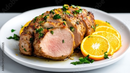 A roasted pork tenderloin, sliced and garnished with herbs and orange zest, rests on a white plate. Orange slices surround it. The image is high-resolution, well-lit, and shows detail. The style is