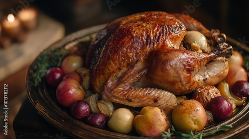 A roasted turkey stuffed with apples and onions, giving it a sweet and savory flavor, presented on a rustic platter.