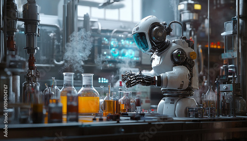a robot working in lab using chemicals generated by AI