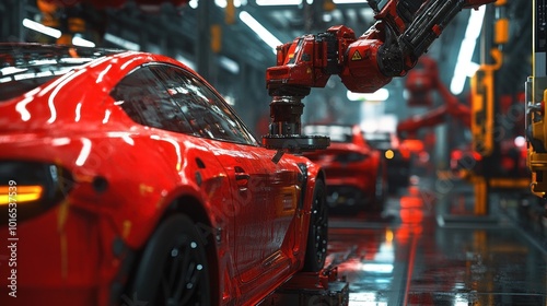 A robotic arm assembles red cars in a high-tech manufacturing facility.