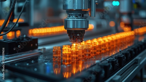 production, line, robotic, arm, amber, ampoule, manufacturing, technology, advanced, modern, automation, process, industrial, system, conveyer, efficient, precision, bottle, machine, engineering, innovation, quality, safety, assembly, device, mechanical, design, streamlined, effective, control, tool, process, workshop, art, abstract, background, illustration, creative, isolated