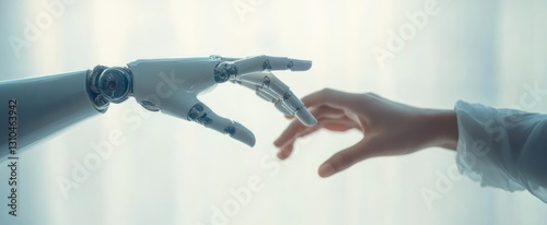 robot, hand, human, connection, future, technology, artificial, interaction, touch, reaching, gesture, finger, automation, assistance, collaboration, synergy, limb, metal, plastic, skin, white, close, delicate, mechanical, arm, advanced, interface, communication, concept, innovation, science, engineering, design, detail, futuristic, modern, health care, assist, help, precision, movement, control, robotic, development, potential, together, meeting