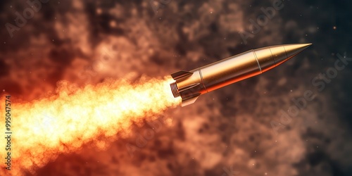 A rocket blasts through space, leaving a fiery trail against a starry backdrop, symbolizing exploration and technological advancement.