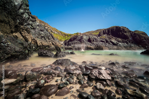 A rocky beach in Cornwall, England, with dark, dramatic rocks leading to a secluded cove with turquoise water under a vibrant blue sky, creates a captivating scene of coastal beauty.
