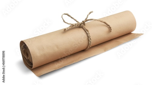 A rolled sheet of white paper tied with twine is positioned against a light gray background