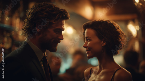 man, woman, connection, cocktail bar, curiosity, blurred background, nightlife, coquetry, body language, serendipity, engagement, urban scene, closeup, eye contact, communication, interest, intrigue, attraction, narrative